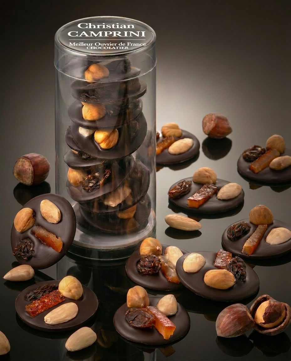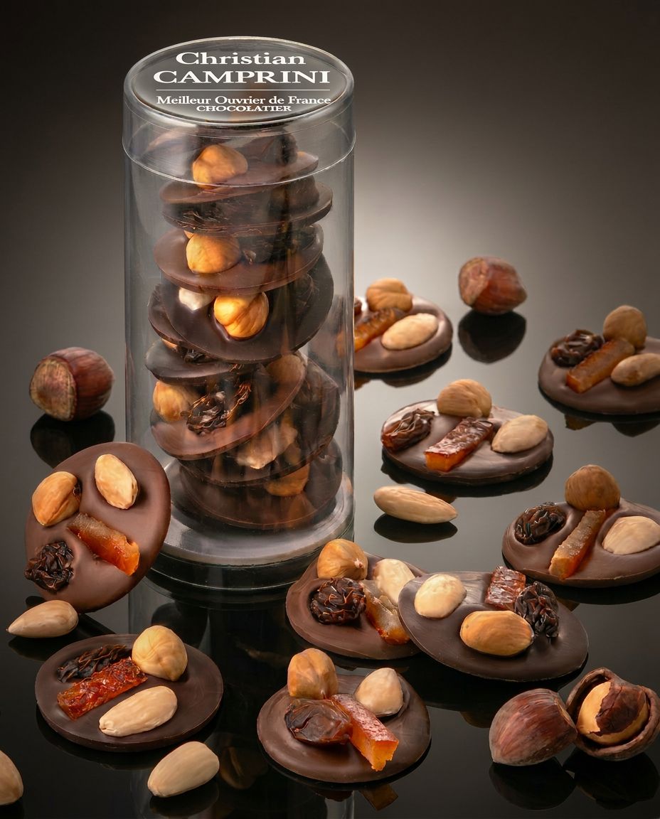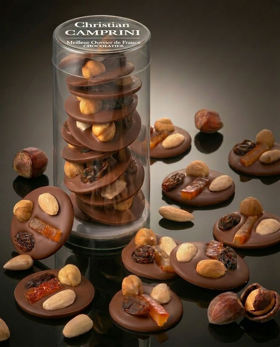 Nos mendiants chocolatés : de fins palets de chocolat, au lait, noir, ou les deux pour les plus gourmands. garnis avec soin d’un assortiment de fruits secs sélectionnés pour leur qualité. Un équilibre parfait entre fondant et croquant, offrant une explosion de saveurs subtiles à chaque dégustation.