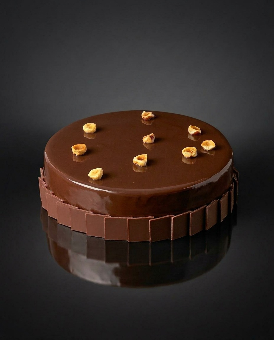 L’entremets des gourmands, aux noisettes du Piémont IGP, mêlée au chocolat lait et au caramel. Un univers de textures, allant du croustillant au fondant, élégamment nappé d’un glaçage noisette.